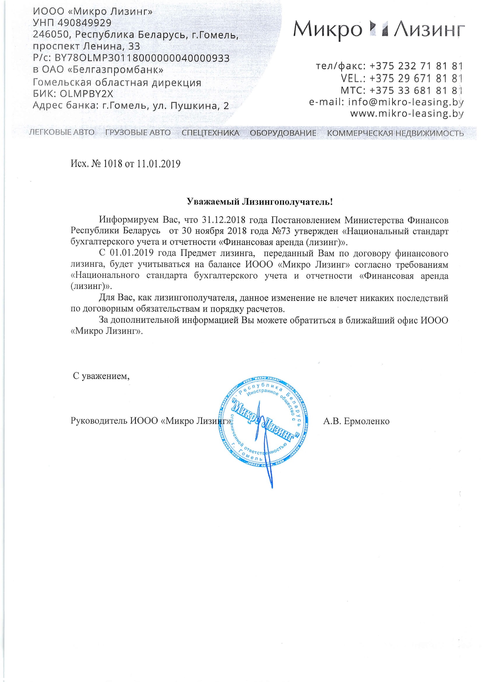 С 01.01.2019 года Предмет лизинга, переданный Вам по договору финансового лизинга, будет учитываться на балансе ИООО «Микро Лизинг» согласно требованиям «Национального стандарта бухгалтерского учета и отчетности «Финансовая аренда (лизинг)».